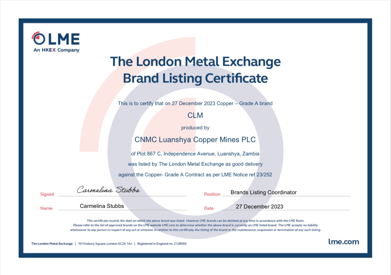 2023年12月27日,倫敦金屬交易所(LME)發布通告,中國有色集團在贊比亞出資企業中色盧安夏銅業有限公司(簡稱中色盧安夏)生產的“CLM”牌A級陰極銅正式進入LME注冊牌號清單之列。