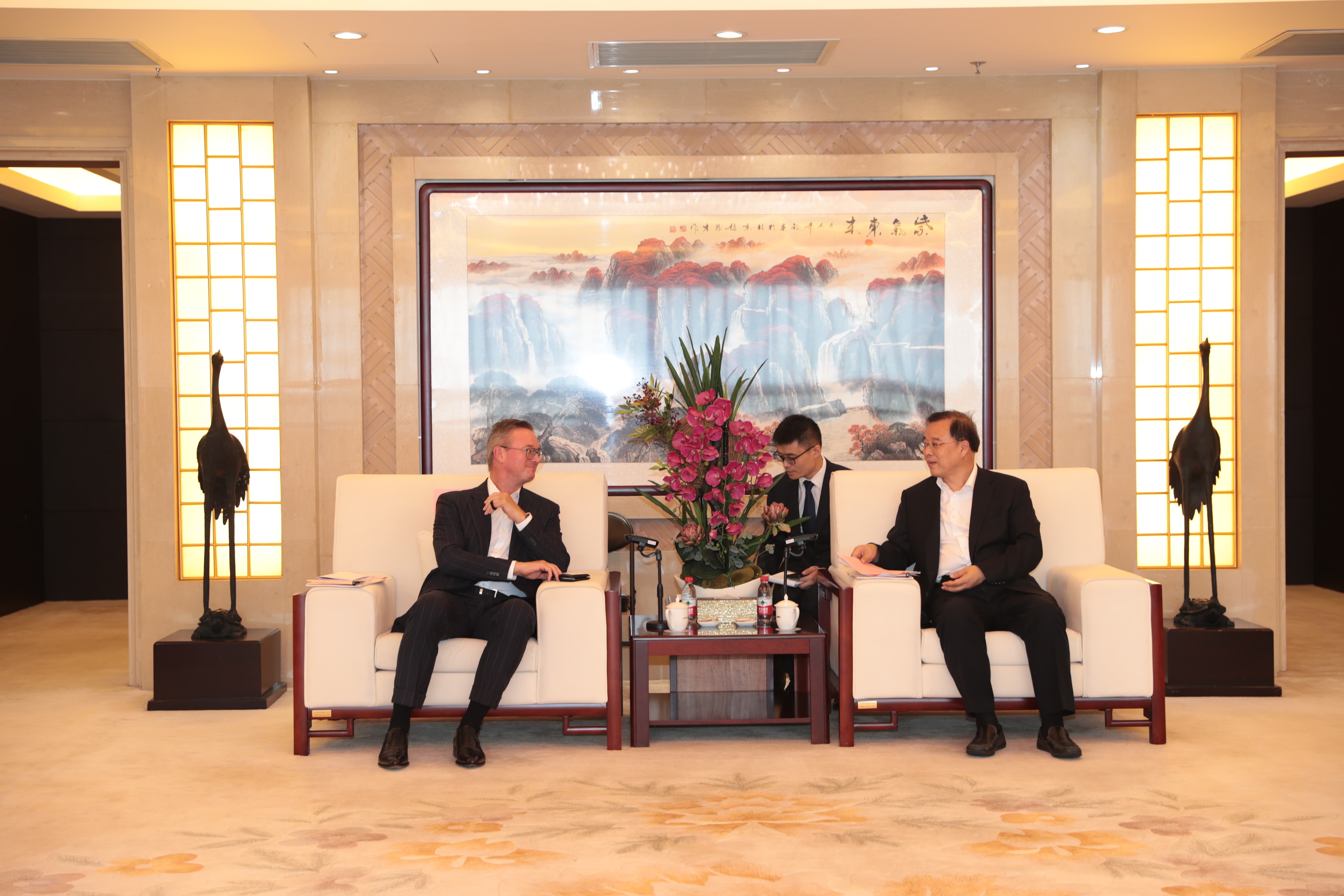 衛杰明董事長感謝奚正平董事長的熱情接待。他表示,今年是托克集團成立30周年,也是托克進入中國30周年。高速發展的中國為托克集團提供了無限的發展機遇,也為托克集團和中國有色集團之間的廣泛合作創造了優越環境。托克集團在貨物貿易、基礎設施、新能源等領域具有獨特優勢,希望雙方加強溝通對接,持續拓展在貿易物流、資源開發等領域合作機會,期待雙方務實合作早日結出碩果。