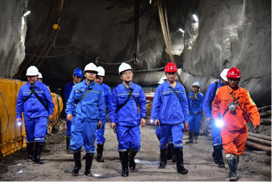 張晉軍一行深入中色大冶銅山口礦坑采車間、選礦生產場地、智能化管控中心,實地檢查了企業安全生產管控情況,察看了井下滾刀式掘進機作業過程、選礦作業流程、礦山智能化建設和科技興安環推進情況,詳細了解了企業安全環保、生產經營等重點工作進展。
